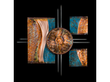 A copper sheet that is sculpted, textured and colored with patinas or painted elements. Each piece is wrapped onto wood frames or floating panels. All work is sealed for protection